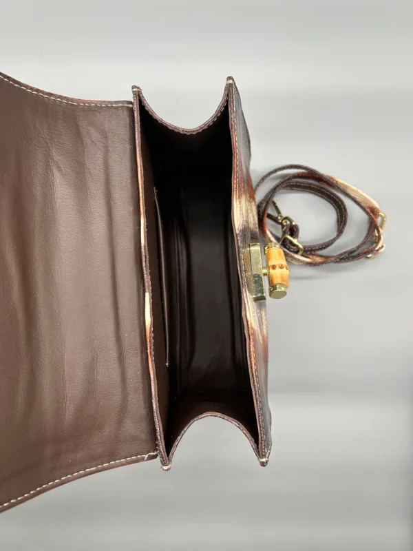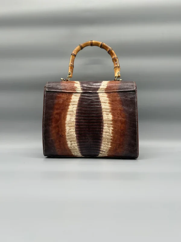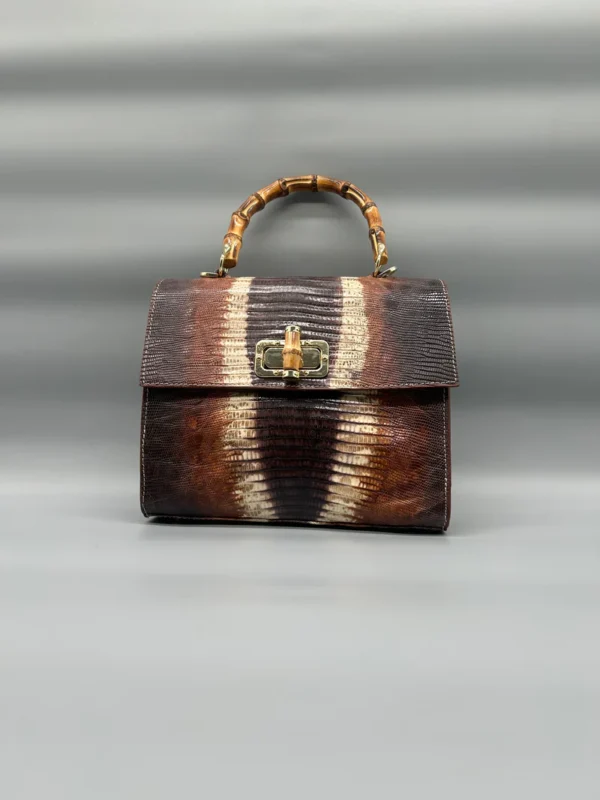 Borsa stondata in pelle di lucertola con un manico in bambù fatta a mano di dimensioni 25x20x10cm marrone bianco e marrone scuro